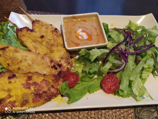 S18-Brochettes de poulet mariné dans du curry jaune,accompagnées de sauce cacahuète (Chicken breast marinated in Thai coconut milk and Thai spices served with peanut sauce)